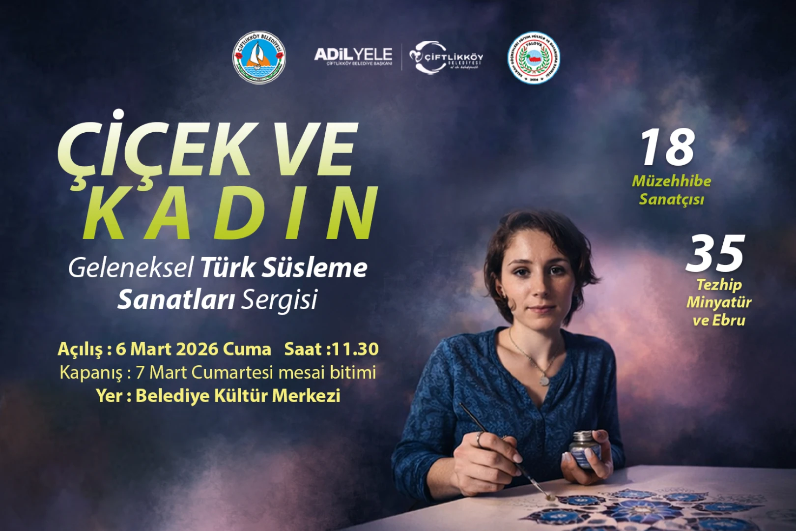 Çiftlikköy, Dünya Kadınlar Günü dolayısıyla geleneksel Türk süsleme sanatlarının zarif örneklerini bir araya getiren özel bir sergiye ev sahipliği yapacak. Çiftlikköy Belediyesi’nin, Yalova Bal-Göç Derneği işbirliği ve Müzehhibe Huriye Baltacı koordinatörlüğüyle düzenlediği ‘Çiçek ve Kadın’ adlı sergide, kadın sanatçıların elinden çıkan tezhip, minyatür ve ebru eserleri sanatseverlerle buluşacak. 18 kadın müzehhibe sanatçısının katkı sunduğu sergide, geleneksel sanatların incelikli işçiliğini yansıtan 35 eser yer alacak. Geleneksel sanatların estetik dünyasını ve kadın sanatçıların üretkenliklerini göz önüne serecek olan sergi, 6 Mart Cuma günü saat 11.30’da açılacak. İki gün boyunca açık kalacak olan “Çiçek ve Kadın” sergisi, Dünya Kadınlar Günü kapsamında ilçede düzenlenen kültür sanat etkinliklerinden biri olacak.