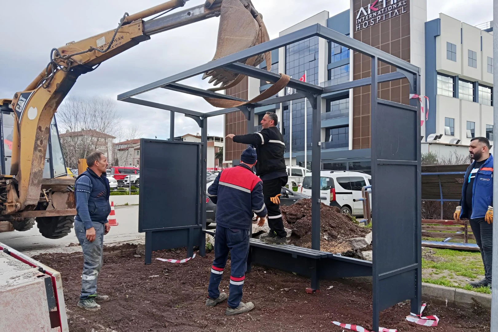 Çiftlikköy Belediyesi’nin ilçe genelinde başlattığı durak yenileme çalışmaları devam ediyor. Otobüs ve minibüs güzergahlarında kullanılan eski tip duraklar, belediyenin kendi kaynak atölyesinde üretilen yeni nesil modellerle değiştiriliyor.