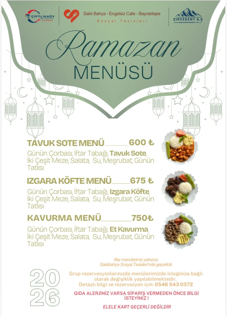 Zirvekent AŞ Müdürü İshak Soyaslan, iftar menülerinin yalnızca Saklı Bahçe Sosyal Tesisleri’nde geçerli olduğunu belirtirken, grup rezervasyonlarında isteğe bağlı olarak menü içeriklerinde değişiklik yapılabildiğini ifade etti. Soyaslan, “Saklı Bahçe sosyal tesislerimizde hazırlanan Ramazan’a özel iftar menüleri, ailelerin ve dost gruplarının huzurlu bir ortamda bir araya gelmesine imkan sunuyor. Bu zaten özel bir kampanya olduğundan dolayı, Elele Kart uygulamamız bu kampanya kapsamında kullanılmıyor. Vatandaşlarımız detaylı bilgi ve rezervasyon için 0546 543 03 72 numaralı telefon üzerinden iletişime geçebilir” diye bilgi verdi.