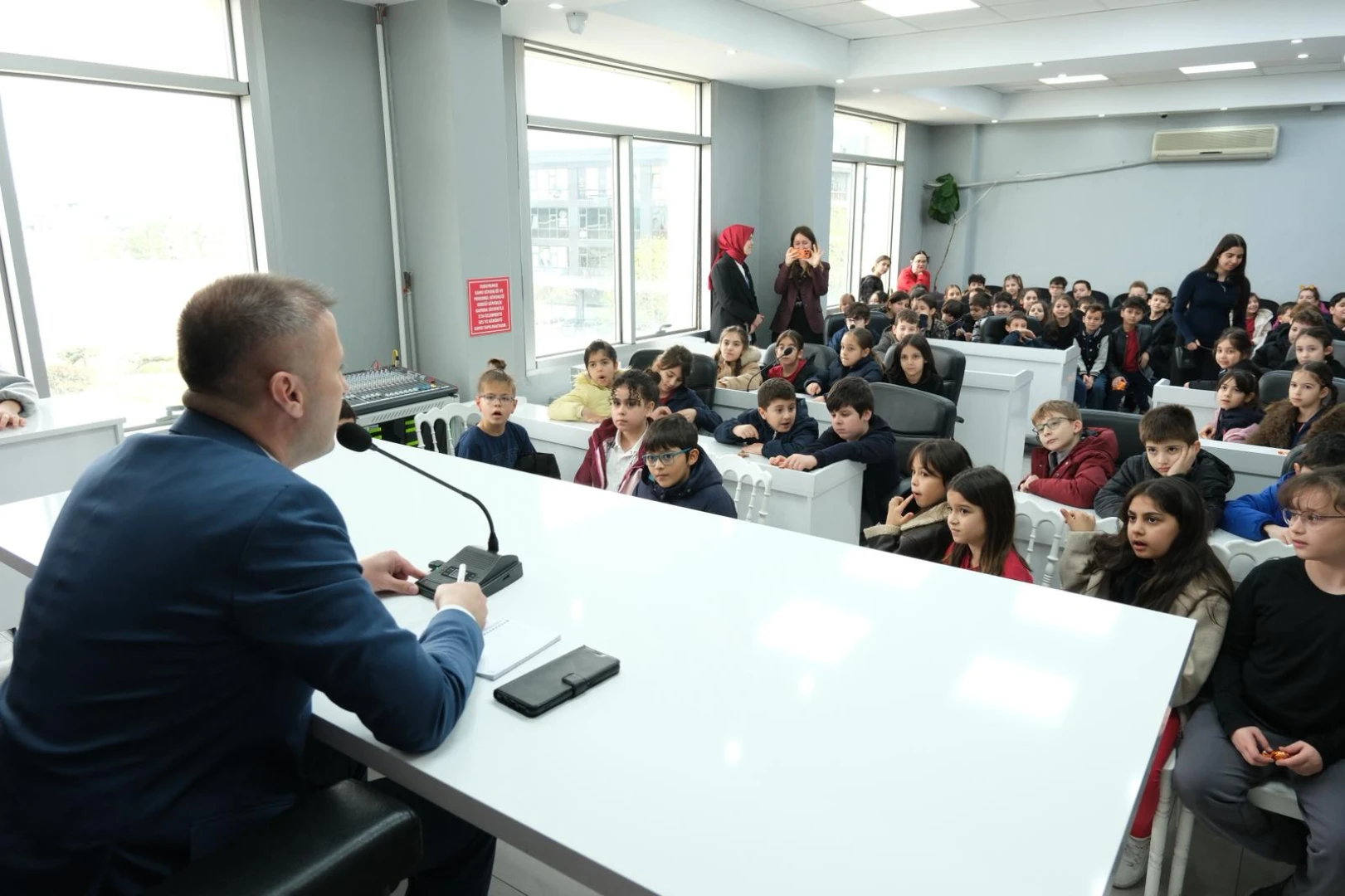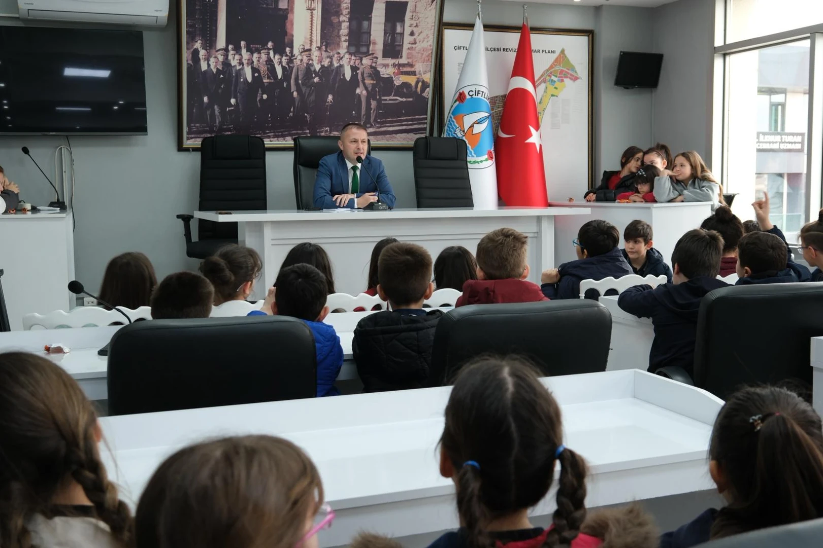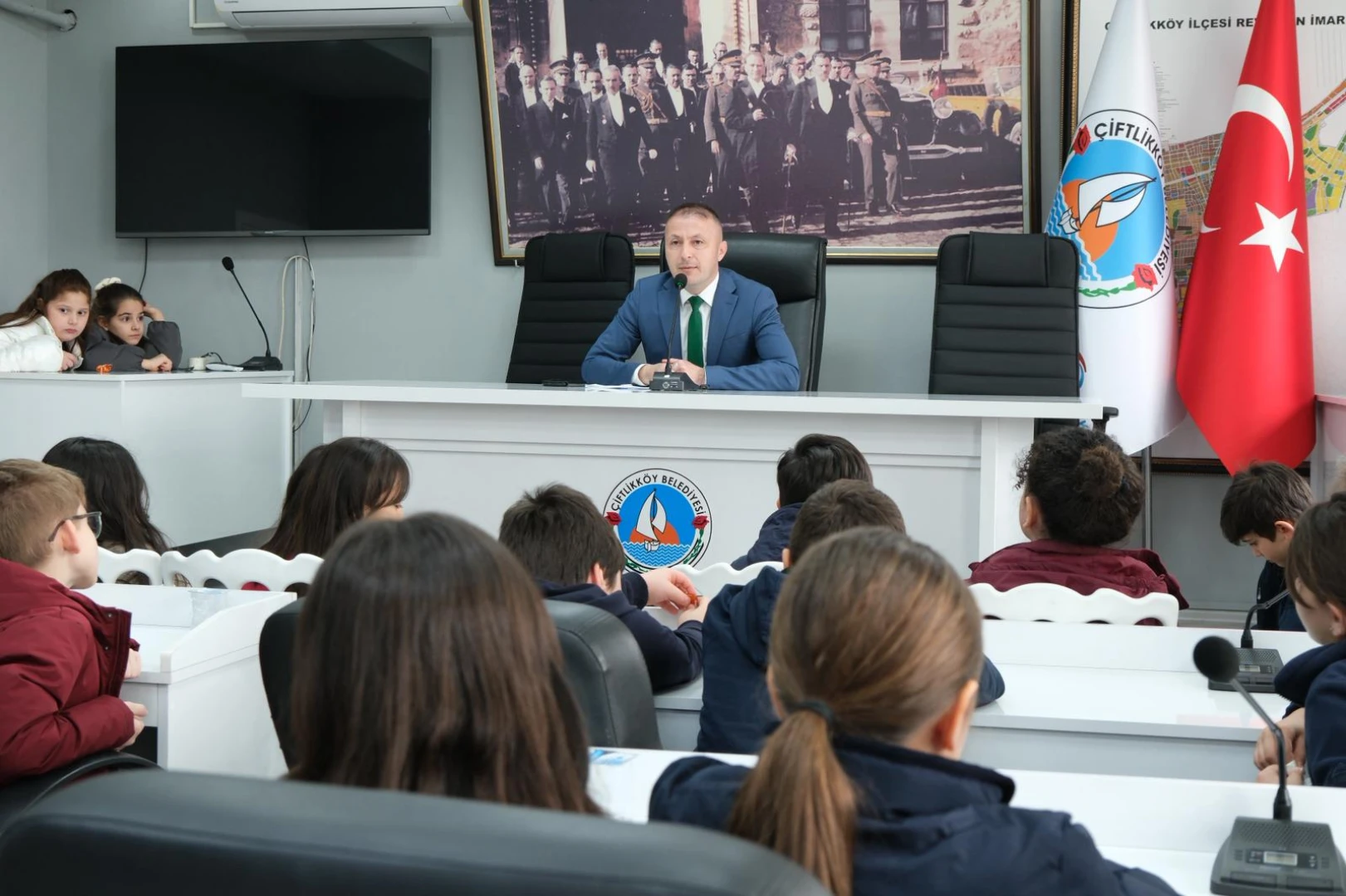Çiftlikköy Belediyesi, Hayat Bilgisi dersleri kapsamında ‘yerel yönetimler’ konusunu gören TED Koleji üçüncü sınıf öğrencilerini konuk etti. Belediye Başkan Yardımcısı Deniz Civelek, sınıf öğretmenleri eşliğinde Belediye Meclis Salonu’nu dolduran 80 minik öğrenciye, belediyelerin nasıl çalıştığı ve Çiftlikköy Belediyesi’ne neler yapıldığını anlattı.