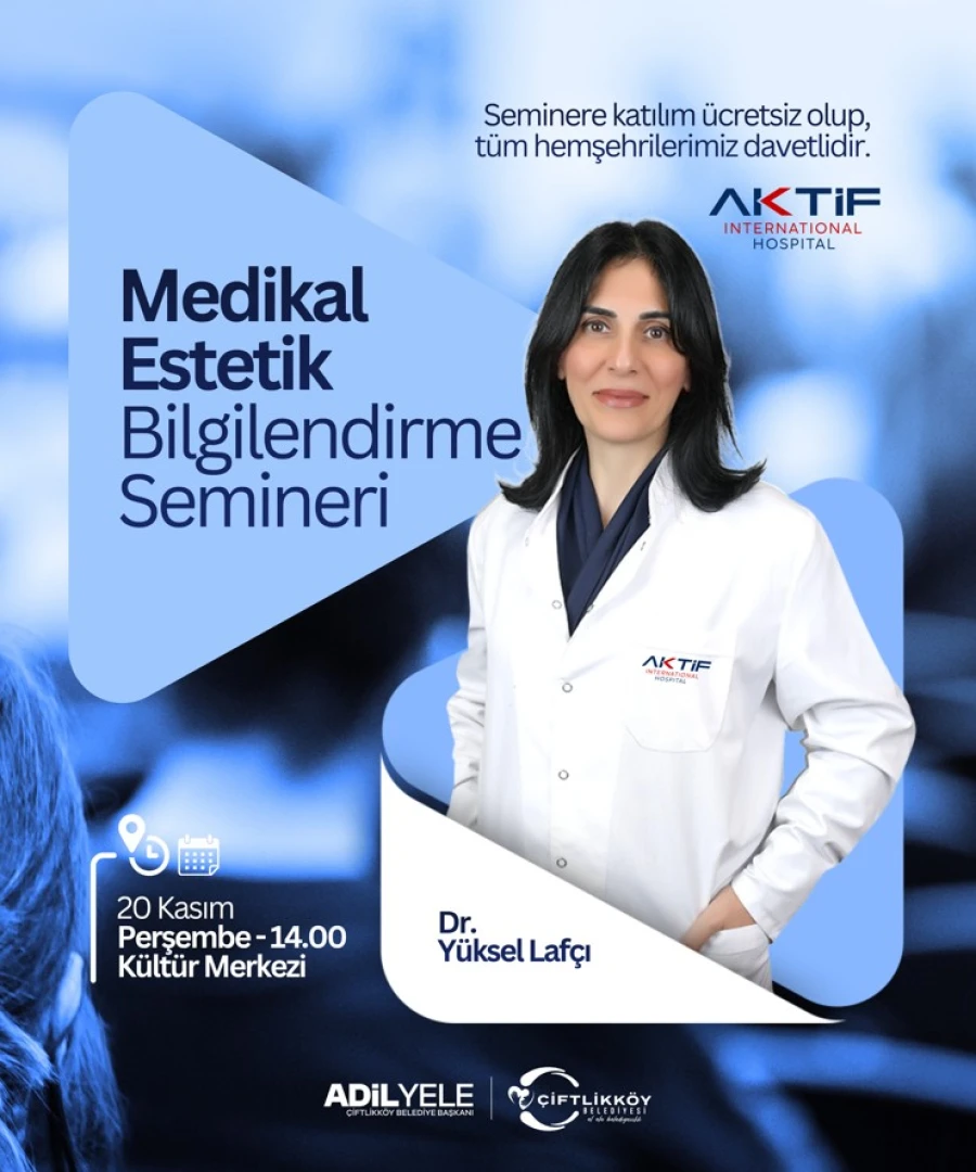 Aktif International Hospital iş birliğiyle düzenlediğimiz Medikal Estetik Bilgilendirme Semineri, 20 Kasım Perşembe günü saat 14.00’te Çiftlikköy Belediyesi Kültür Merkezi’nde sizlerle.