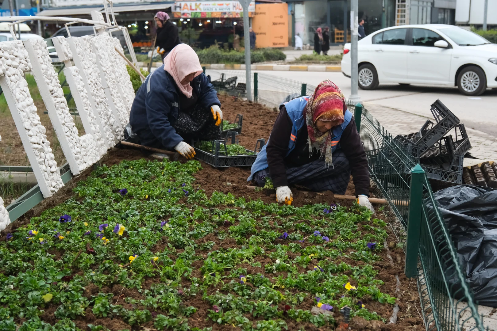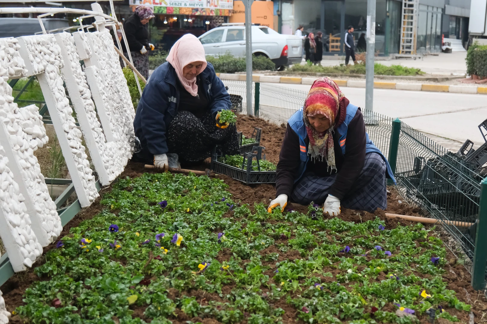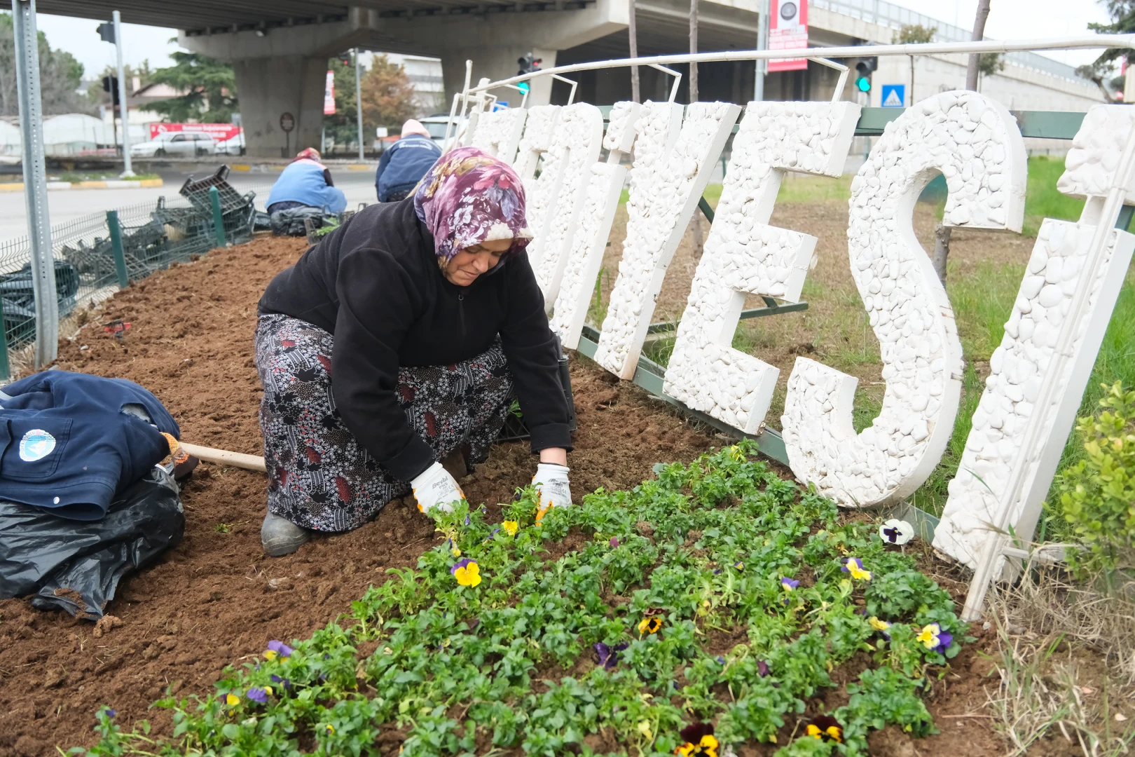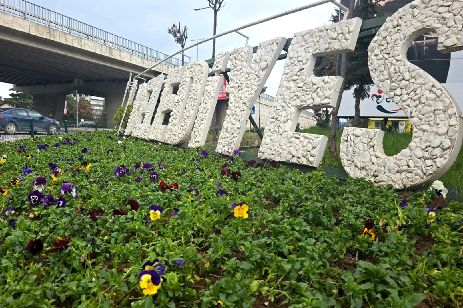 Çiftlikköy Belediyesi Park ve Bahçeler Müdürlüğü ekipleri, Atatürk Caddesi girişini 1000 adet hercai menekşeyle renklendirdi.