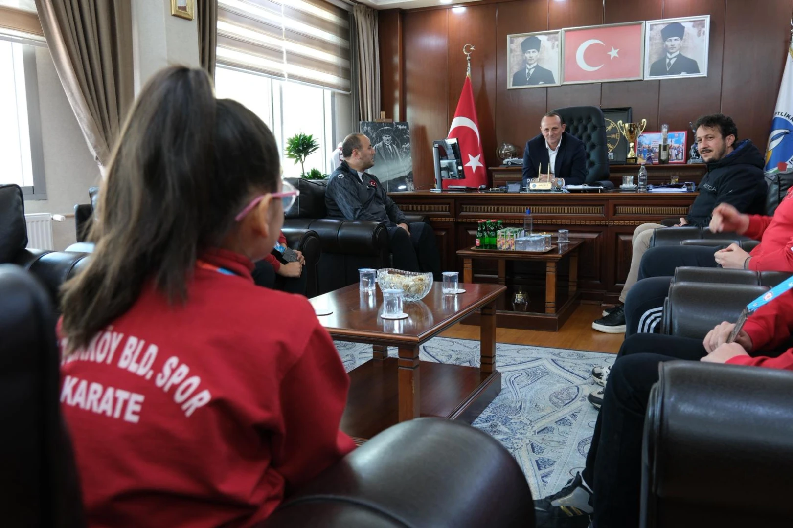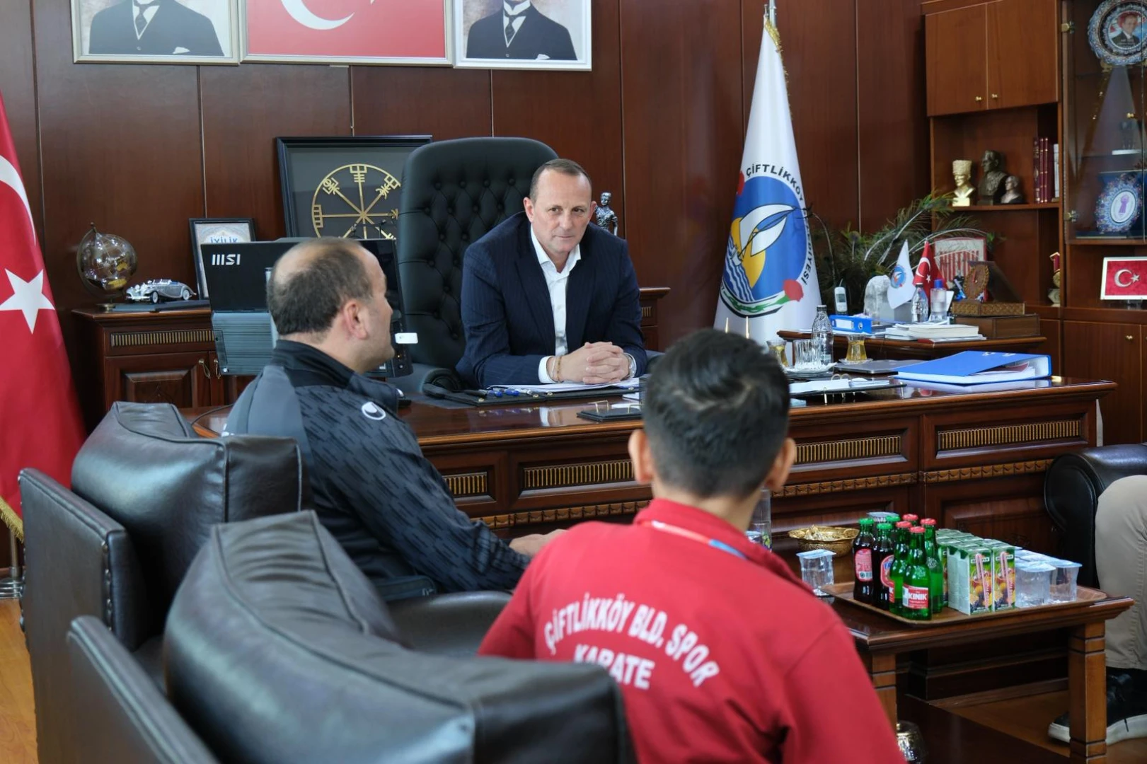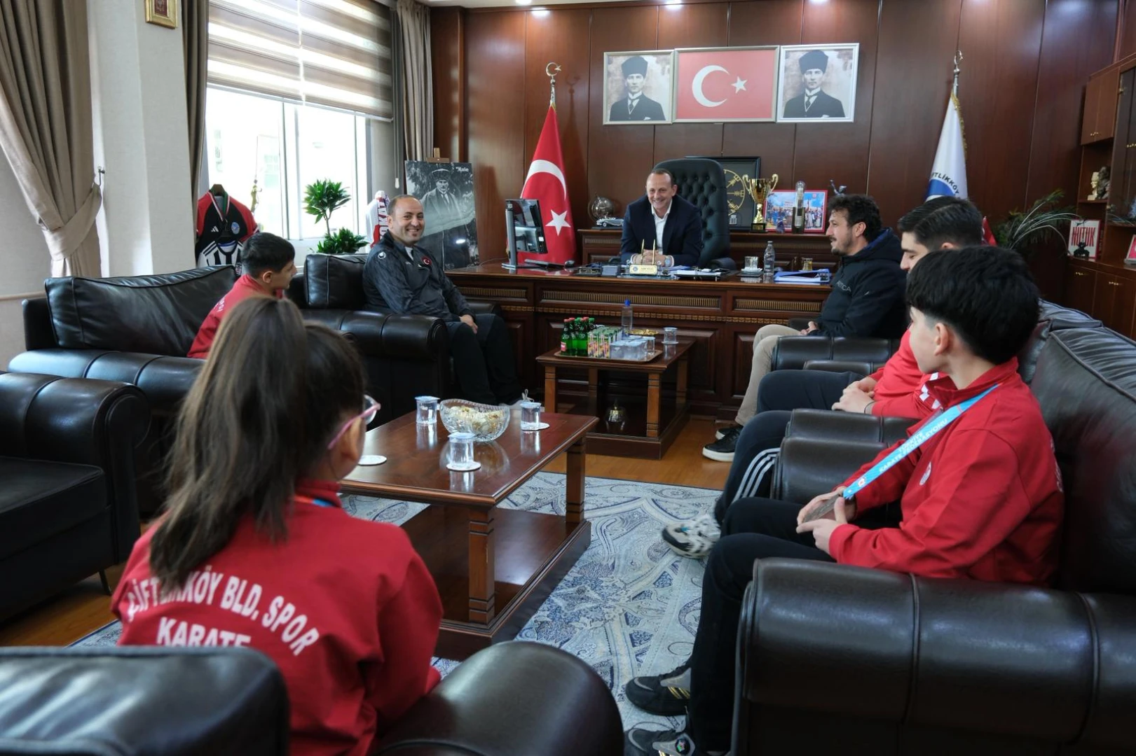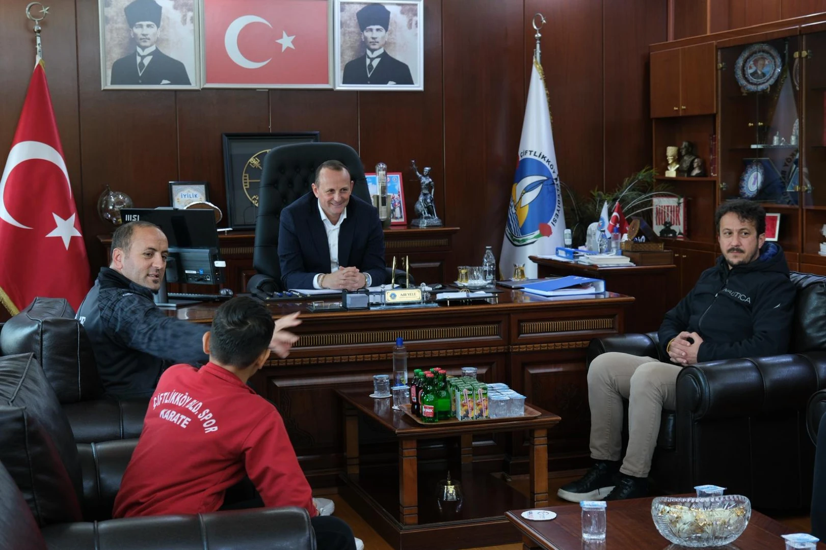 Başkan Yele, “Başarılarıyla göğsümüzü kabartan sporcularımızı, Başantrenörümüz Halil İbrahim Yüksektepe, asistanı Rahman Emirhan Özüdoğru ve Belediyespor yöneticilerimizle birlikte belediyemizde ağırladık. Türkiye Yıldızlar ve Minikler Karate Şampiyonası’nda elde ettikleri derecelerle ilçemize büyük bir gurur yaşatan evlatlarımızı yürekten kutluyorum. Bu başarıda emeği olan antrenörlerimize ve ailelerimize teşekkür ediyor, Çiftlikköy’ümüzün adını gururla duyuran sporcularımızın başarılarının devamını diliyorum” dedi.